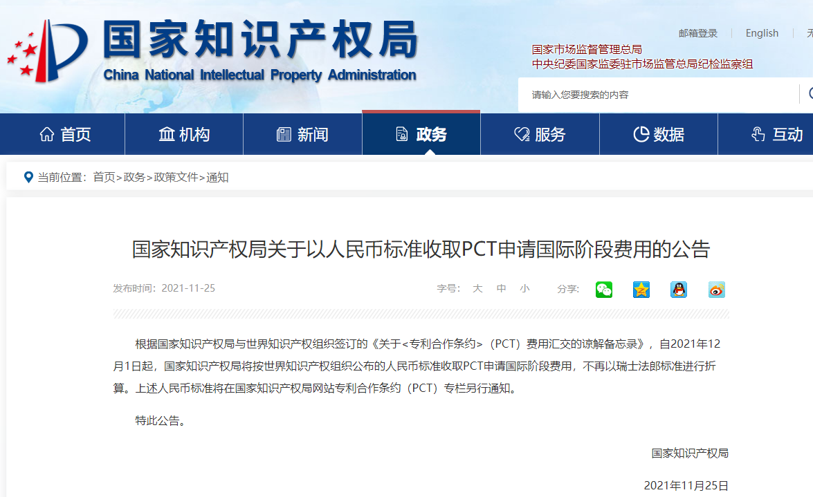 根据国家知识产权局与世界知识产权组织签订的《关于<专利合作条约>(PCT)费用汇交的谅解备忘录》,自2021年12月1日起,国家知识产权局将按世界知识产权组织公布的人民币标准收取PCT申请国际阶段费用,不再以瑞士法郎标准进行折算。