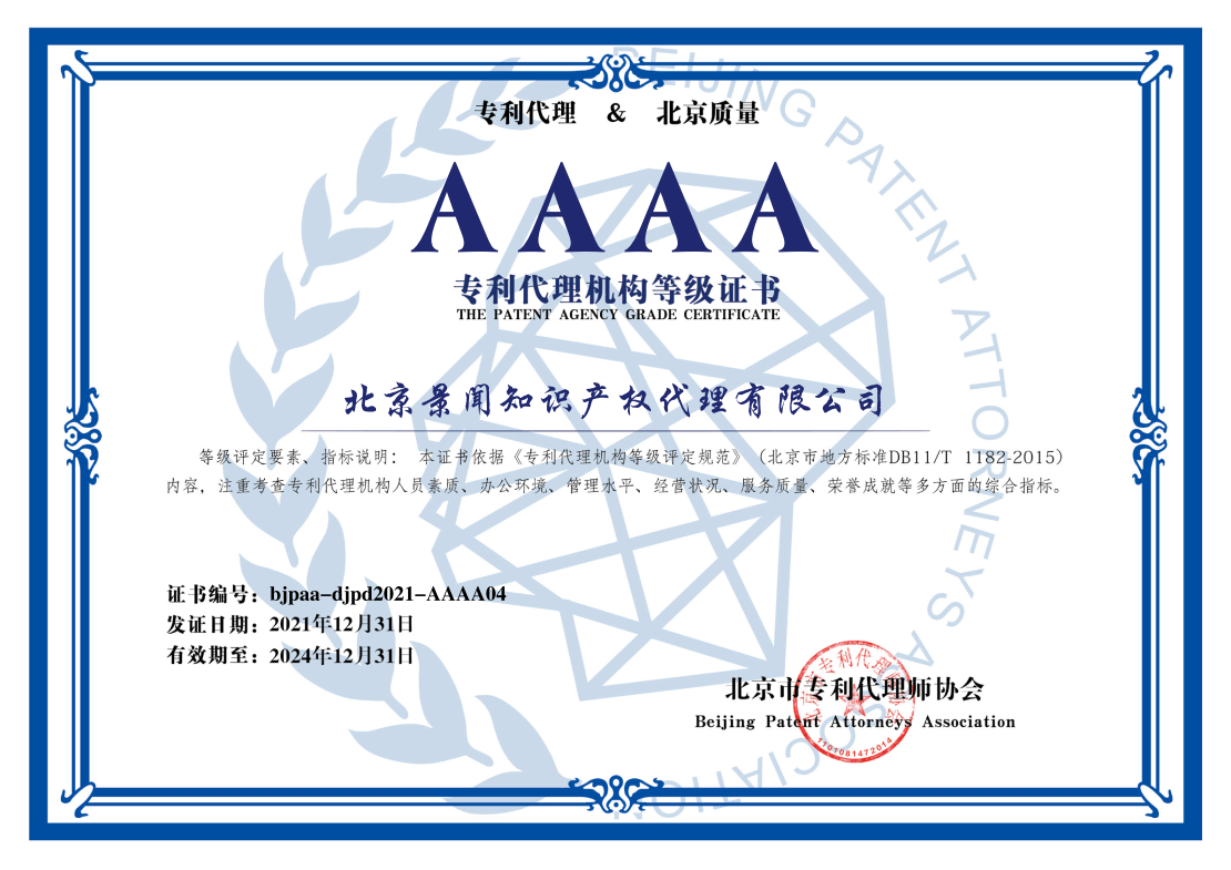 北京市专利代理师协会近日公布了 “2021年北京市专利代理机构等级评定结果”,景闻获得该项AAAA级专利代理机构,体现了知识产权业界对景闻知识产权服务综合实力的高度认同。