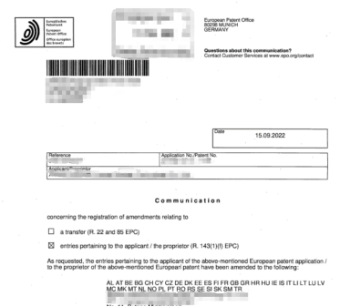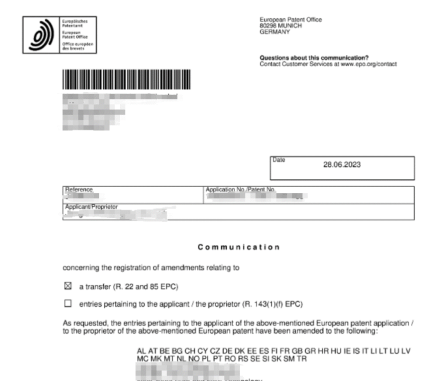 (3)欧洲专利局一般会在收到变更文件后两个月左右发出登记通知,通知书如下所示:
