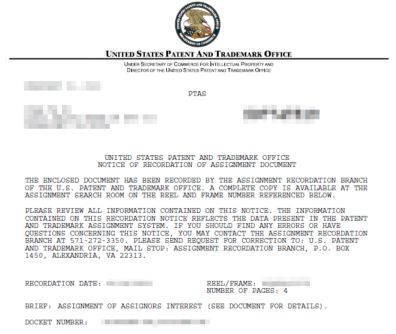 (4)美国专利局一般会在收到转让文件后两周左右发出登记通知,通知书如下所示: