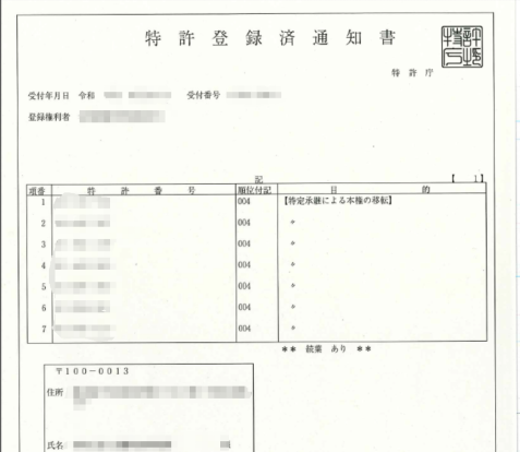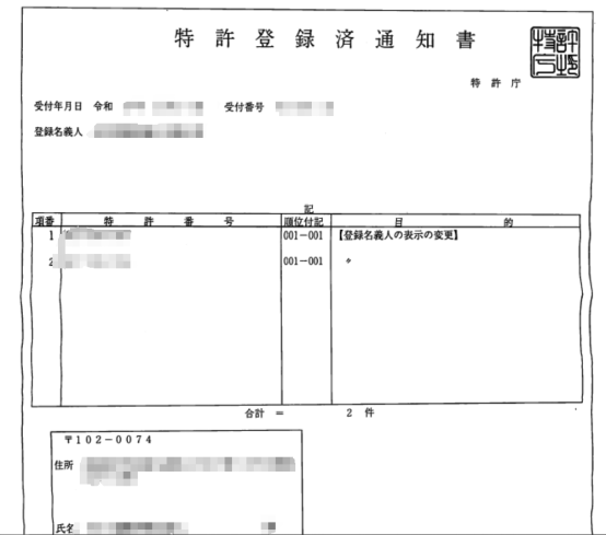 (4)日本专利局一般会在收到变更文件后一个月左右发出登记通知,通知书与申请人/专利权人变更通知书格式相同。