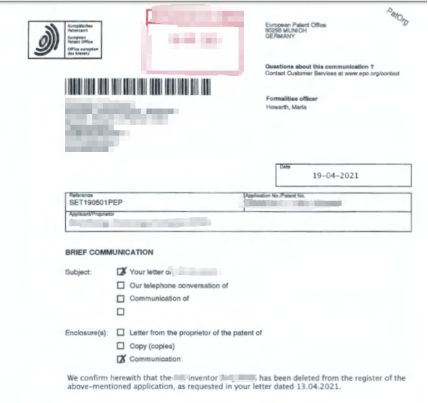 (4)欧洲专利局一般会在收到变更文件后两个月左右发出登记通知,通知书如下所示:
