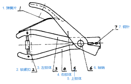 对比文件2(CN2223080Y,公告日1996年3月27日)公开了一种骨科内固定术用钢针尾折弯钳,该折弯钳通过左钳体3和右钳体4对钢针7进行夹紧固定,收拢上钳体5,钢针将围绕夹持钳头中的一个弯折(参见说明书第1-2页),如下图2所示。