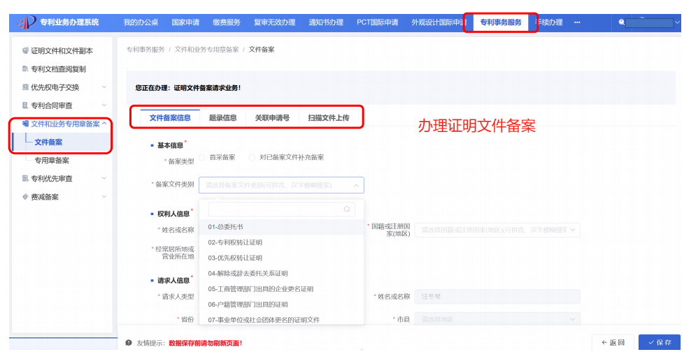 通过专利业务办理系统-专利事务服务-以电子方式提出办理各种“文件和业务专用章备案”办理请求获取相应证明文件的备案编号。