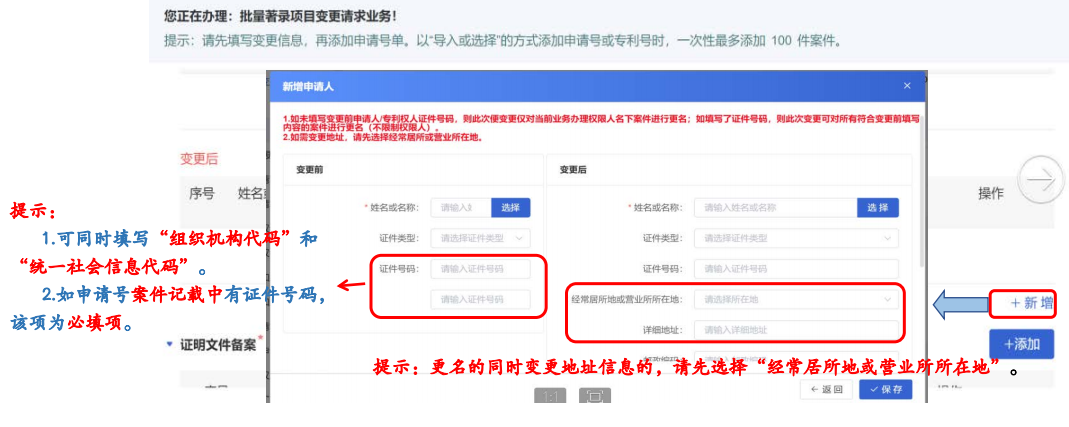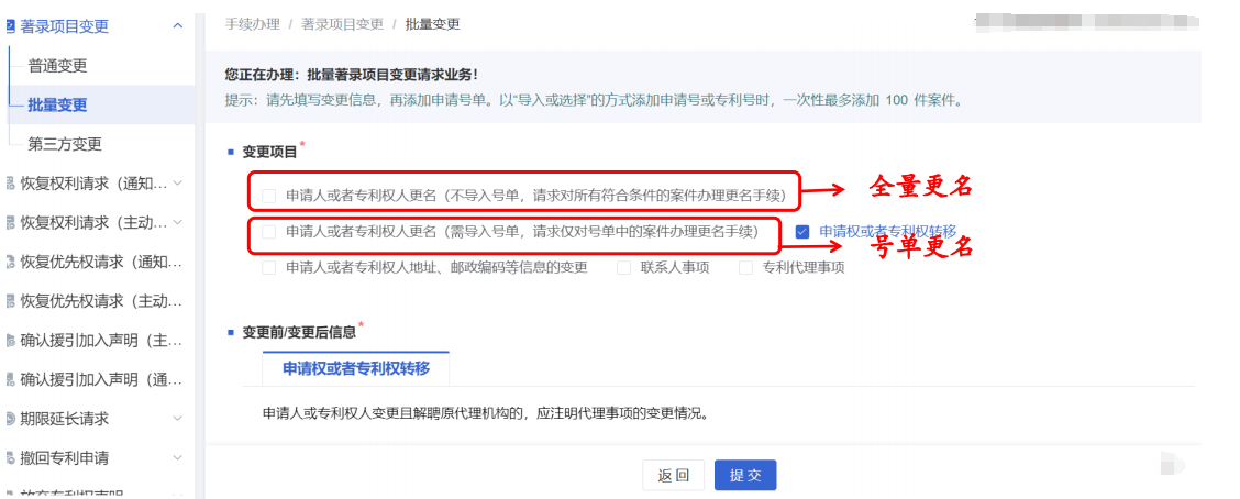 由于号单更名比全量更名能够更为方便准确地获知已完成更名的申请号/专利号,因此推荐当事人选择号单更名的方式办理批量更名手续。