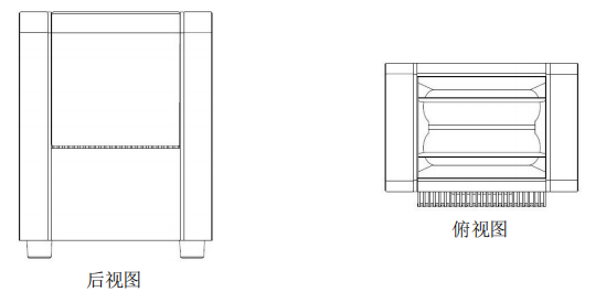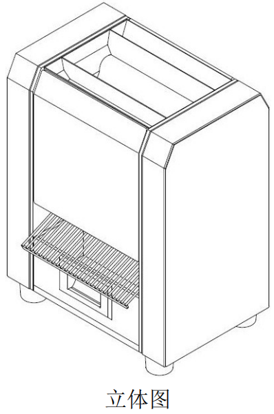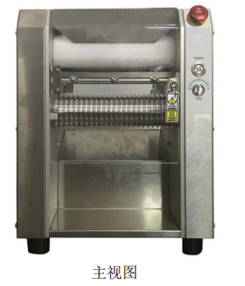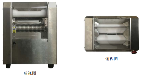 食品成型加工设备为长方体结构;主视图上方约三分之二为面板,下方有一格栅,格栅下方有长方形出口;俯视图可见两个进料的辊和进料引导;后视图为面板,分为上下两段;左右视图整体为长方形的面板,左上角和右上角为斜角(详见下图)。