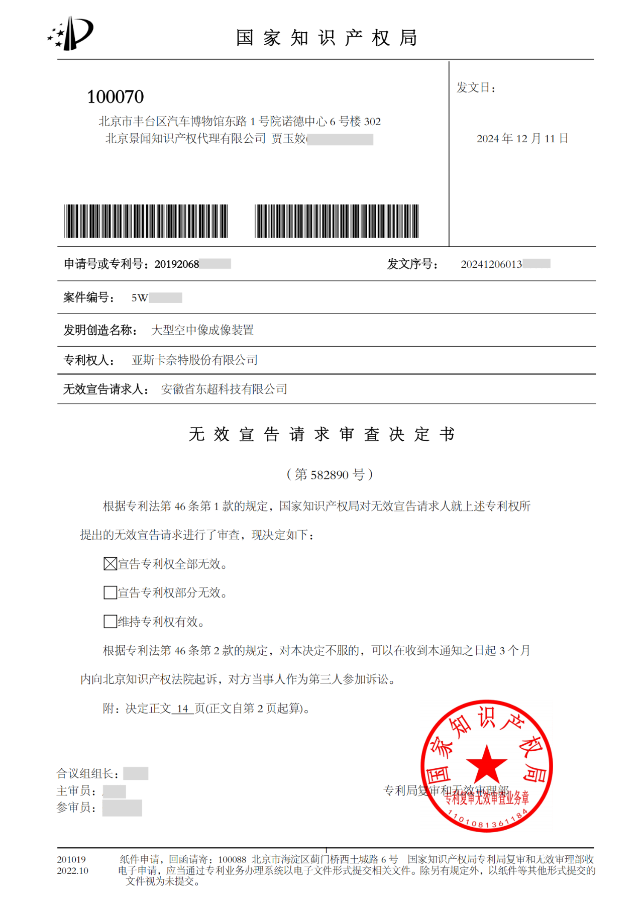 国家知识产权局作出第582890号决定,宣告亚斯卡奈特股份有限公司所持的实用新型专利“大型空中像成像装置”的专利权全部无效。这一胜利不仅维护了东超科技的合法权益,也为客户在市场中的稳定发展提供了坚实的法律保障。